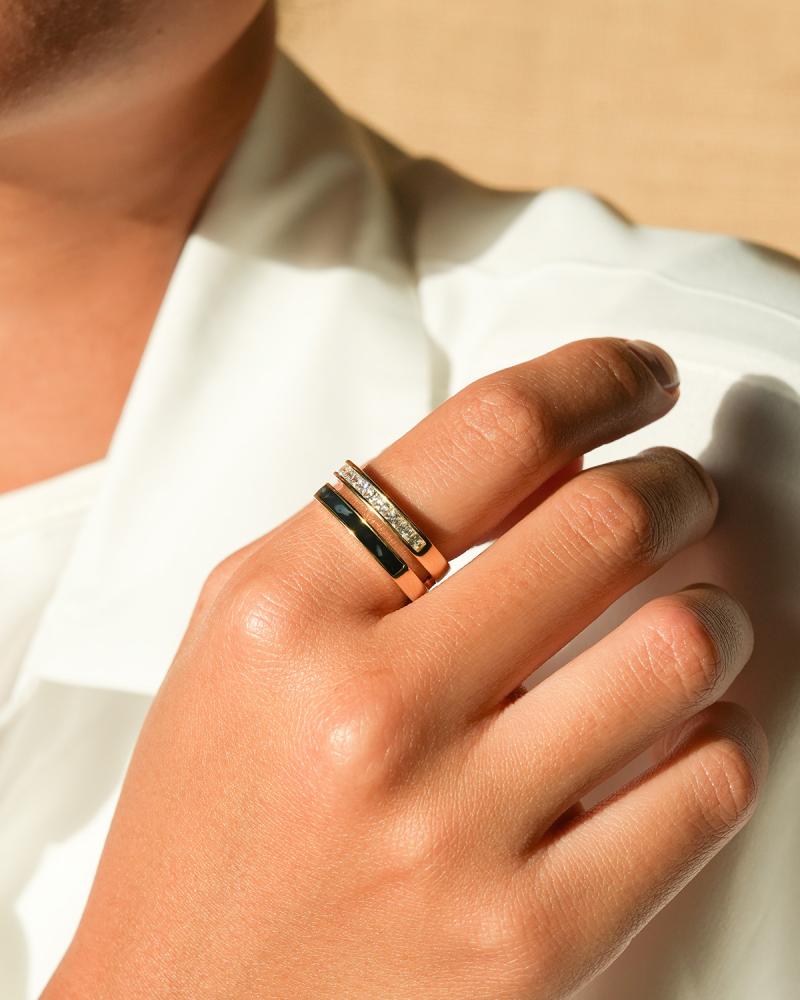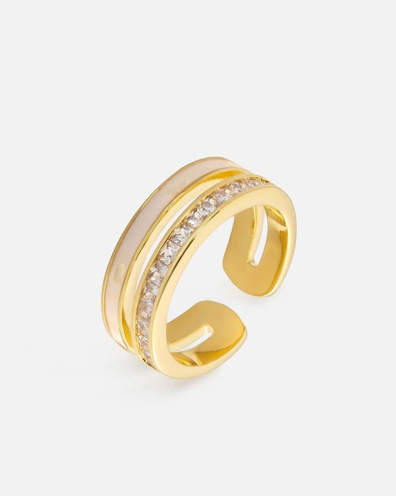 خاتم بتصميم أنيق يمزج فخامة اللون الصدفي والذهبي وبريق فصوص الزركون الساحر