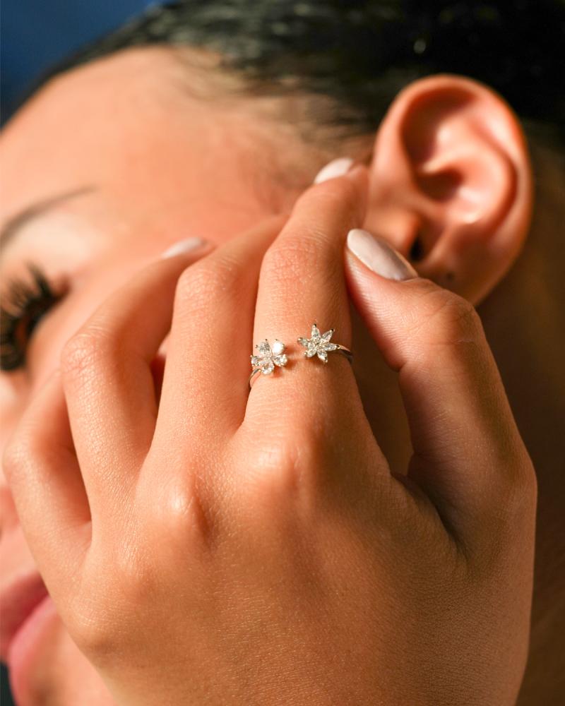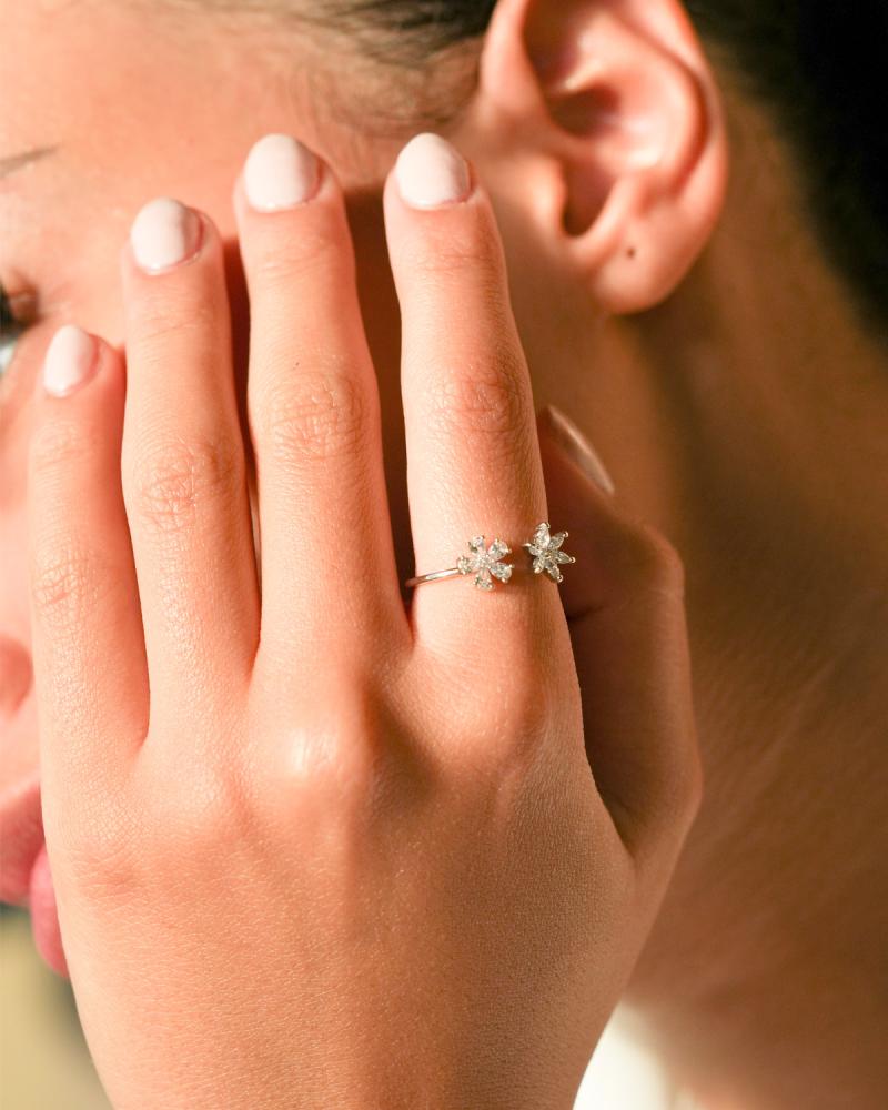 خاتم بتصميم ناعم وجذاب يضفي الرونق الساحر على اطلالتك بتصميم حلي بشكل ورد مرصعه بأحجار الزركون