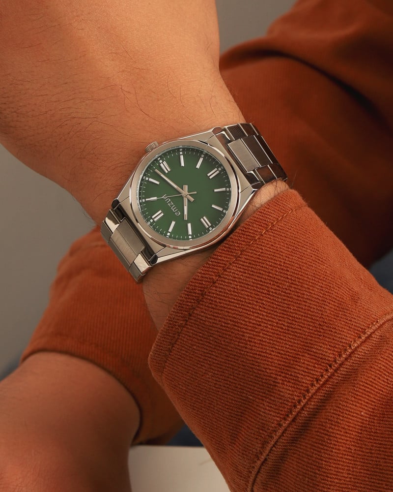 ساعة رجاليه من ماركة ايمزوري بسير من الستانلس ستيل باللون الفضي ، ساعة بتصميم كلاسيك أنيق ، ساعة بميناء بلون أخضر بتصميم كلاسيك ، تعكس هذه الساعة الأطلاله الانيقه للرجل العصري في المناسبات المهمه والاطلالات اليوميه ، يمكنك تنسيق الساعة مع إطلالتك في كل الأوقات لطله متميزه