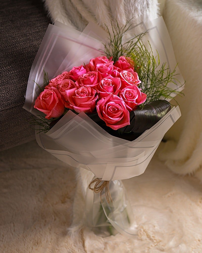 - باقة من ورد الجوري بعدد 15 وردة باللون الوردي الساحر