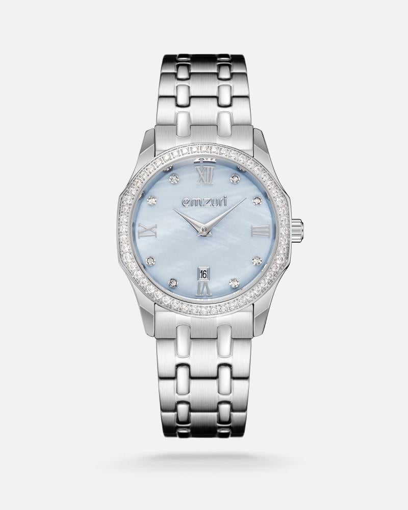 • ميناء الساعة : بلون أزرق بإطار مرصع بفصوص الزركون وبمقاس: 29 mm