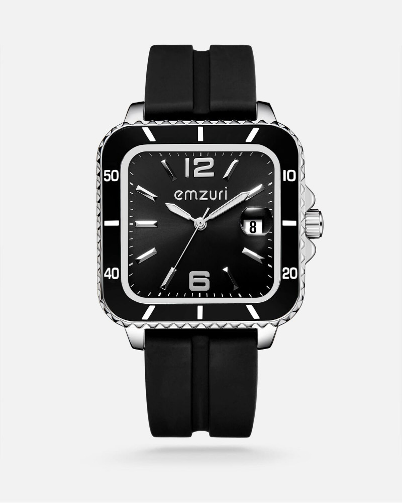 ساعة رجاليه من ماركة ايمزوري بسير من الربل باللون الأسود ، تتميز الساعة بالميناء بشكل مربع باللون الأسود وبإطار عريض ملفت للنظر يتزين بعداد للدقائق، ساعة عمليه خفيفه على اليد ، تتميز بأنها تناسب كل الأطلالات الرسميه و الكاجوال اليوميه ، تصميم الساعة العملي الخفيف يجعل منها الاختيار الأفضل لك لكل يوم .