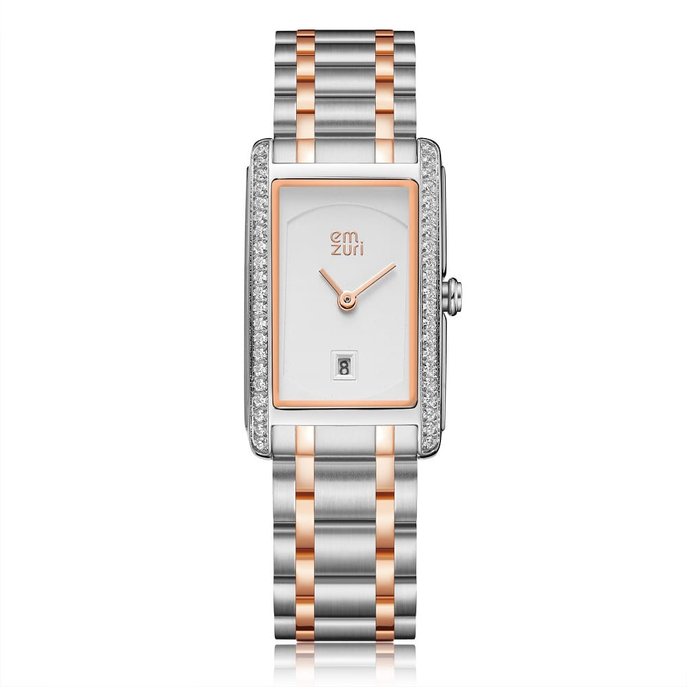 ساعة نسائيه من ماركة إيمزوري بتصميم راقي من الستانلس ستيل باللون الفضي والروز قولد ، تتميز الساعة بالميناء المستطيل باللون الأبيض بتفاصيل أنيقه وبعدد من فصوص الزركون المحدده لمكان الأرقام وبإطار مرصع بفصوص الزركون ، يمكنك تنسيق الساعه مع إطلالتك اليوميه ، نسقي الساعه مع إطلاله رسميه في العمل او إطلاله مسائيه كاجول .